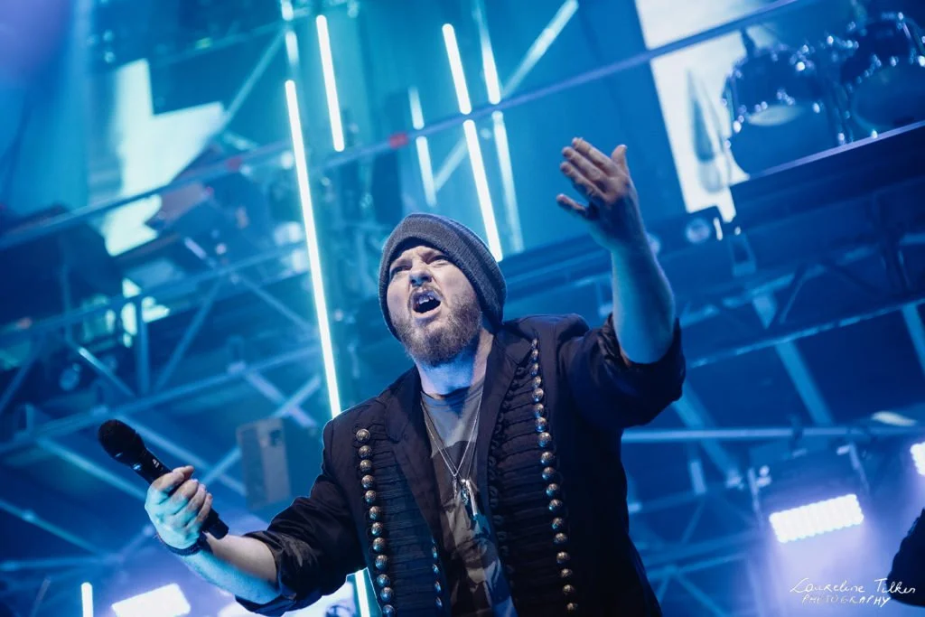 Now that we know who was present, let’s talk about the stage! The setups have always been very impressive, with the castle from “Electric Castle Live“ being perhaps the most impressive to date. This time, however, there was a lot of industrial-looking scaffolding for decoration that acted as a very suitable raiser for parts of the show: the string section was on the lower stage-right, with the drums at the bottom stage-left, both of which had visuals on small screens beneath them. Then, there was a raised central platform in the scaffolding, with Joost van den Broek‘s keyboard setup on the upper stage-right and the choir, comprised once more of Marcella Bovio, Irene Jansen, and Jan Willem Ketelaers, on the upper stage-left. Beyond that, there were several long, thin vertical screens that hosted various videos or images to enhance the music. The outer wall designs were large metalwork flats that had shapes in them. Some comments online called it a missed opportunity that there wasn’t a binary message in them, while others suggested that that space would have been better put to use by a few screens. As a short person in the land of the tall, I don’t disagree with this latter sentiment, as, despite the stage being very tall in 013, for short people like myself and our photographer, seeing the stage outside of the front row could be a problem if you weren’t right up front, on the stairs, or on the balcony.