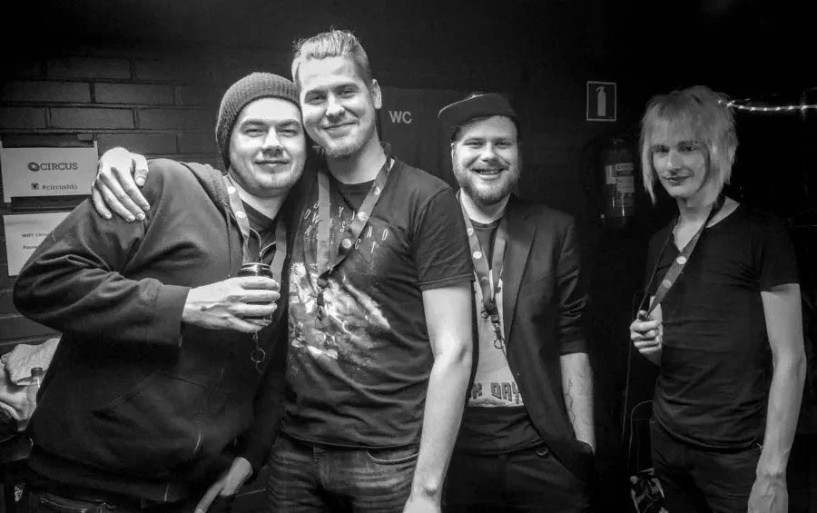 It took us a while to find each other following their set, but we were finally able to get together backstage where the band was relaxing and enjoying some refreshments. While our interview was, in essence, with Benji Connelly [keyboards] and Mikael Salo [vocals], the rest of the band was lurking around or sitting nearby, and offered their two cents every now and then. The exception here was Markus Laito [guitar], who had been sick, powered through their set, and headed off immediately after the show.